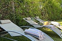 Im ersten Stock befinden sich 2 weitere Schlafzimmer, eines mit einem großen Doppelbett und Zugang zu einer privaten Terrasse mit Hängematten mit Blick auf den Pool und den Garten, Ankleidezimmer, Schminktisch, Fernseher und eigenem Bad mit Dusche und Badewanne; und ein weiteres mit einem großen Doppelbett, großen Kleiderschränken, Schreibtisch für Telearbeit, privater Terrasse mit Blick auf den Garten und den Pool und eigenem Bad mit Dusche.